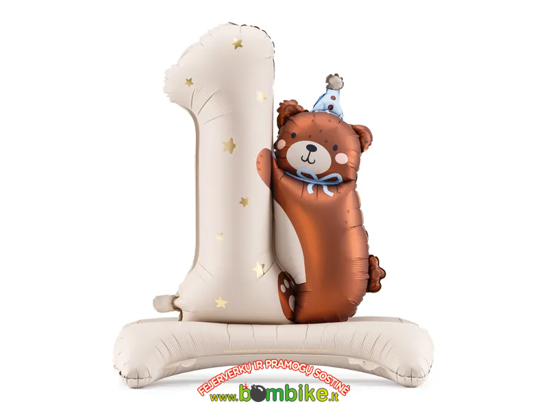 Labai gražus, matinių spalvų pastatomas balionas – skaičius kartu su meškučiu.